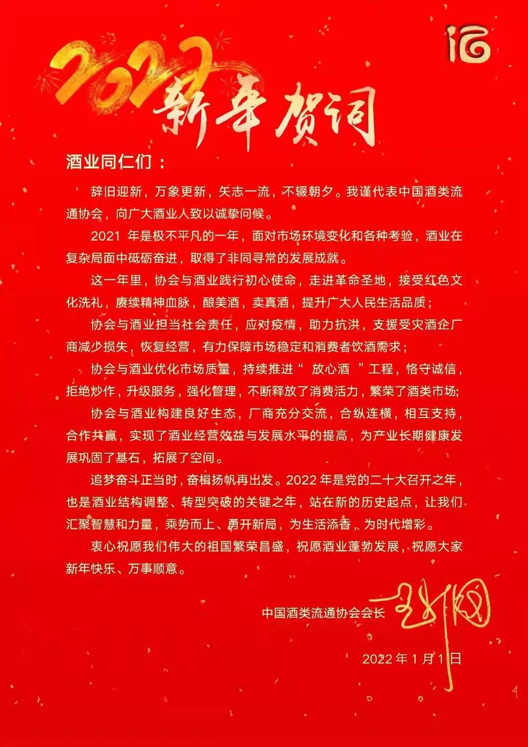 中國(guó)酒類流通協(xié)會(huì)會(huì)長(zhǎng)王新國(guó)祝酒業(yè)同仁新年快樂(lè)!